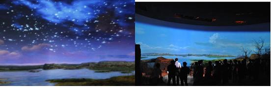 帶著對水洞溝的好奇,坐上大巴,很快見到了傳說中的水洞溝,剛走進(jìn)大門,看到的是一片荒涼,心中不免有些失望。隨著導(dǎo)游的聲音,走進(jìn)了水洞溝遺址博物館實景體驗區(qū),我的心情豁然開朗,從繁星點點的蒼穹、裊裊升起的炊煙、成群奔跑的犀牛、鴕鳥、羚羊,到水洞溝人打磨石器、分割獵物、制作鴕鳥蛋皮項鏈,到家園被毀、水洞溝人含淚離開,我們在短短10分鐘內(nèi)體驗到“夢回三萬年”的情景。一切都是那么真實,那么鮮活,仿佛遠(yuǎn)古的水洞溝先民就從我們身邊緩緩走過。